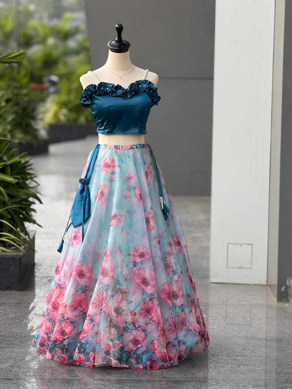Lehenga – Pure organza silk digital printed lehenga with a grand 8-meter flair, finished with canvas patta for beautiful structure