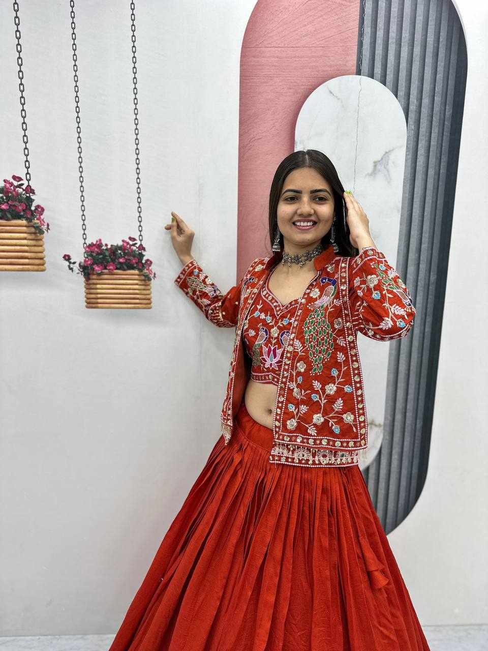 PC 559 New Modern Party Wear Red Lehnga With Jacket has been successfully added to your cart .