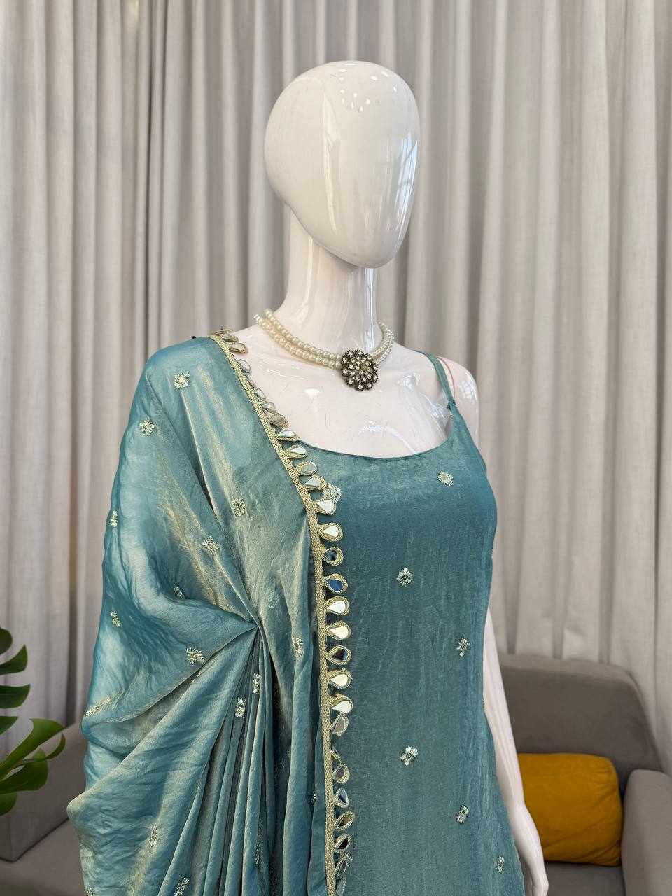 Add a graceful sparkle to your festive collection with this elegant Fendy Silk Kurti Plazo Set, beautifully designed with thread, sequence, and real mirror work. Perfect for festivals, family functions, parties, and special occasions.