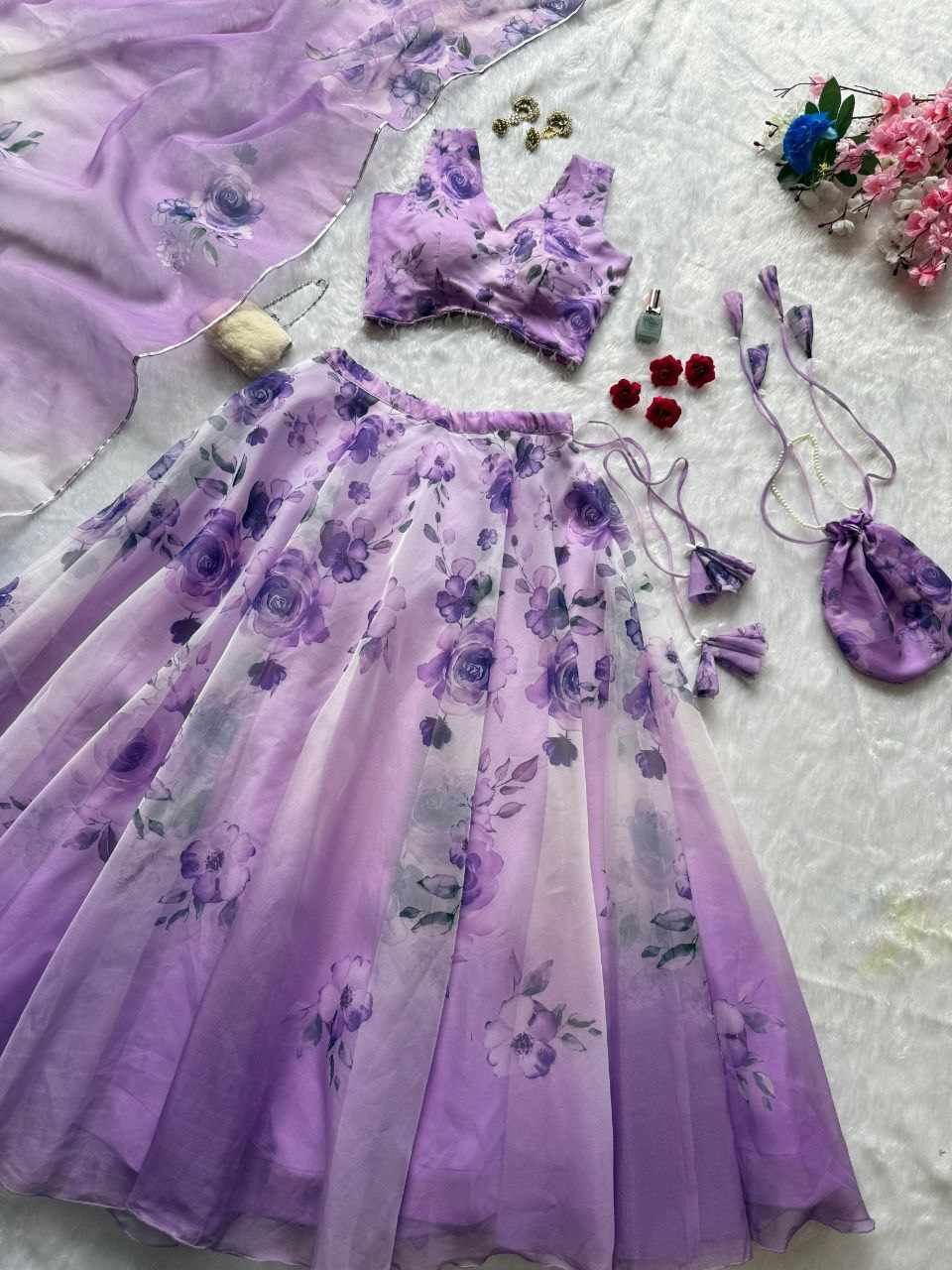 Lehenga – Pure organza silk digital printed lehenga with a grand 8-meter flair. Finished with canvas patta for a perfect flare
